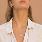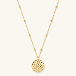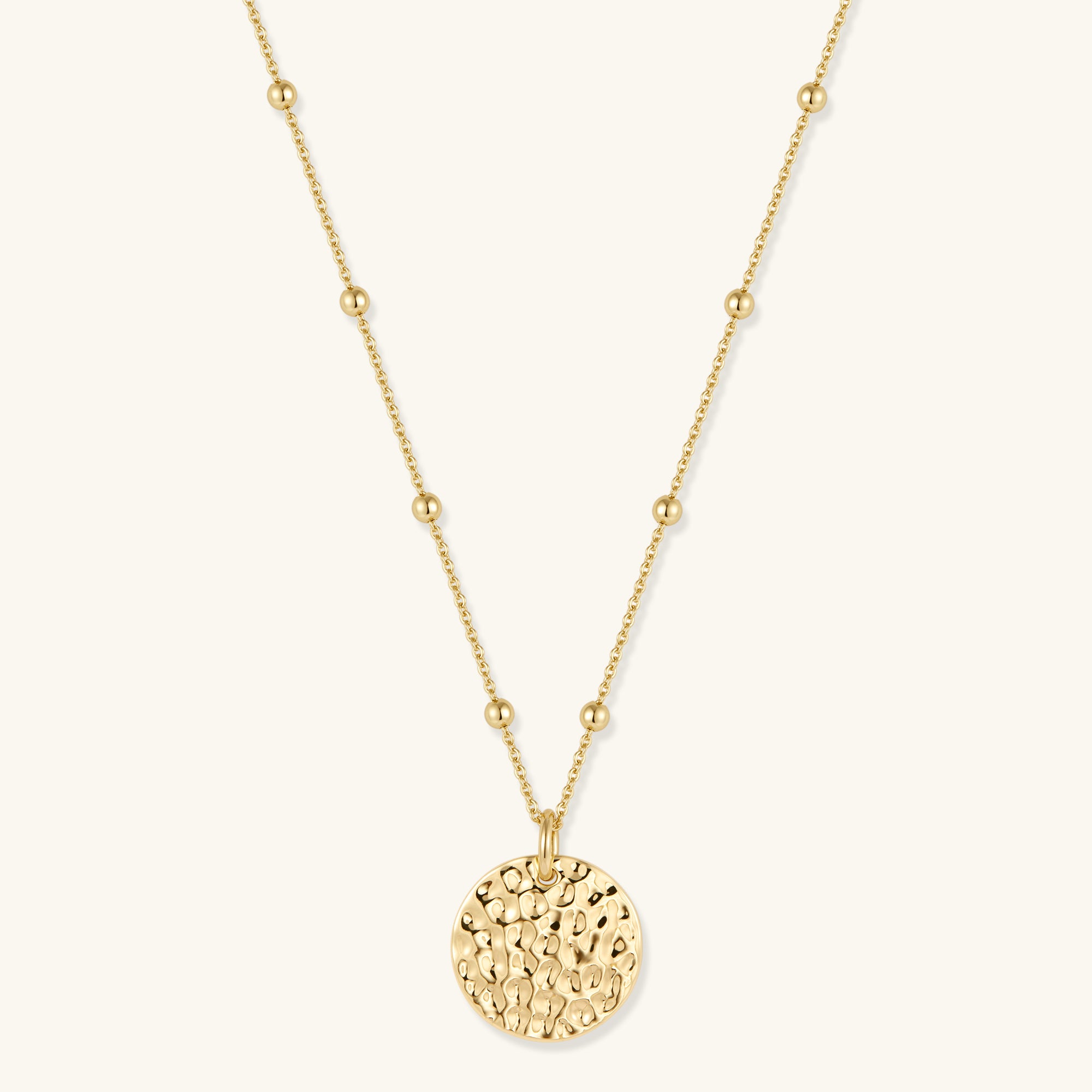 Our Gold Filled Hammered Coin Necklace features a hammered gold coin pendant on a beaded chain. Our 14k gold-filled jewelry is bonded with 14k gold and is water and tarnish resistant. 14k gold-filled jewelry is a great alternative to solid gold, and can be worn by people with sensitive skin.