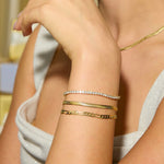 Our Herringbone bracelet is a golden staple to wear alone or stack with our other gold filled bracelets. Our 14k gold-filled jewelry is bonded with 14k gold and is water and tarnish resistant. 14k gold-filled jewelry is a great alternative to solid gold, and can be worn by people with sensitive skin. The color will not tarnish but recommend to keep away from perfumes and lotions.