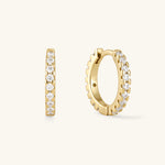 A pair of cubic zirconia gemstones accent these huggie earrings. Perfect for layering with all your favorite earrings. Designed for any occasion and everyday wearability. Pair with our smaller huggie hoops!