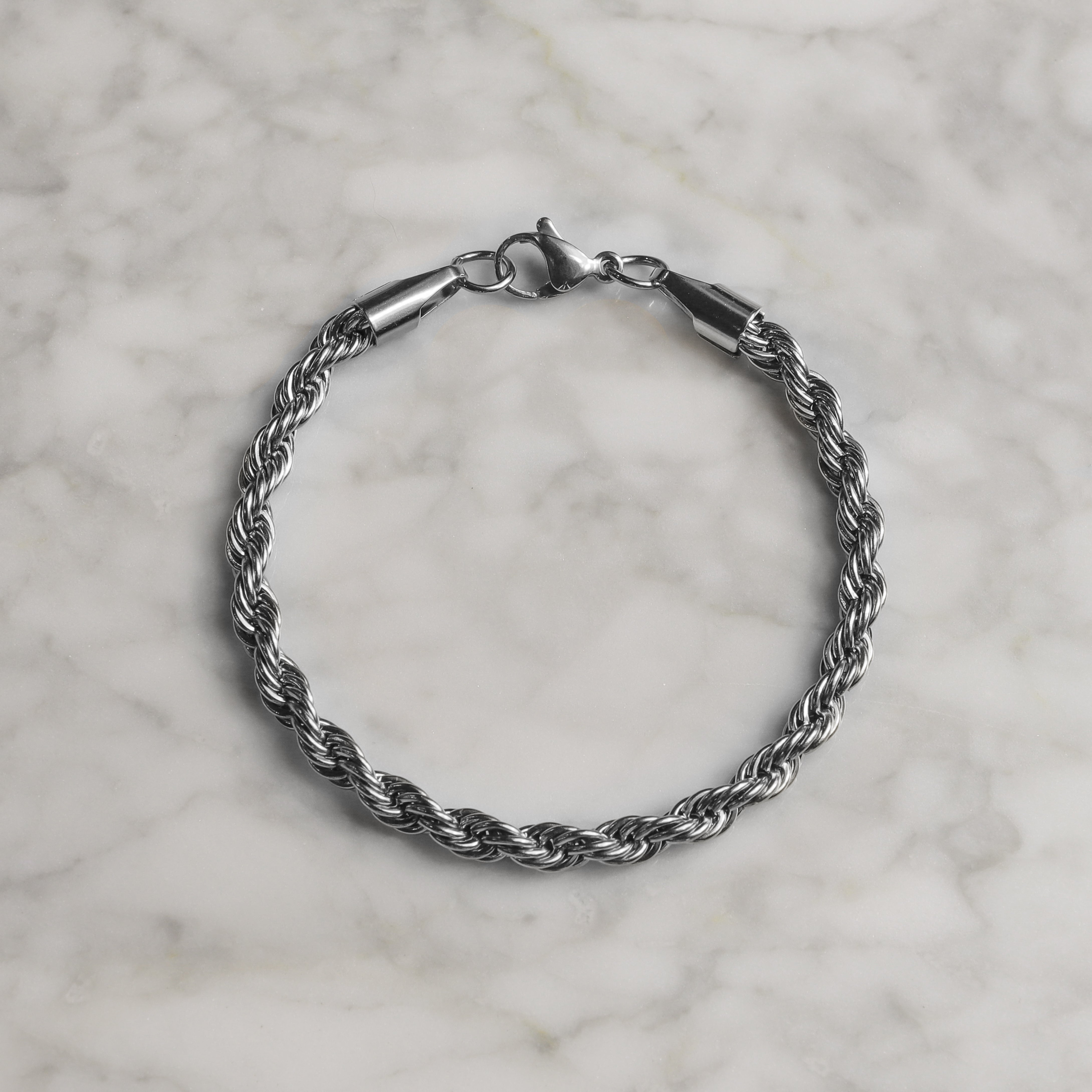 This bracelet boasts a classic rope link design, measuring 5mm in width for a bold and stylish look. The chain is sturdy and durable, making it perfect for daily wear or special occasions. With a secure clasp, you can wear it with confidence knowing it will stay in place. This bracelet is versatile enough to complement any outfit, from casual to formal.