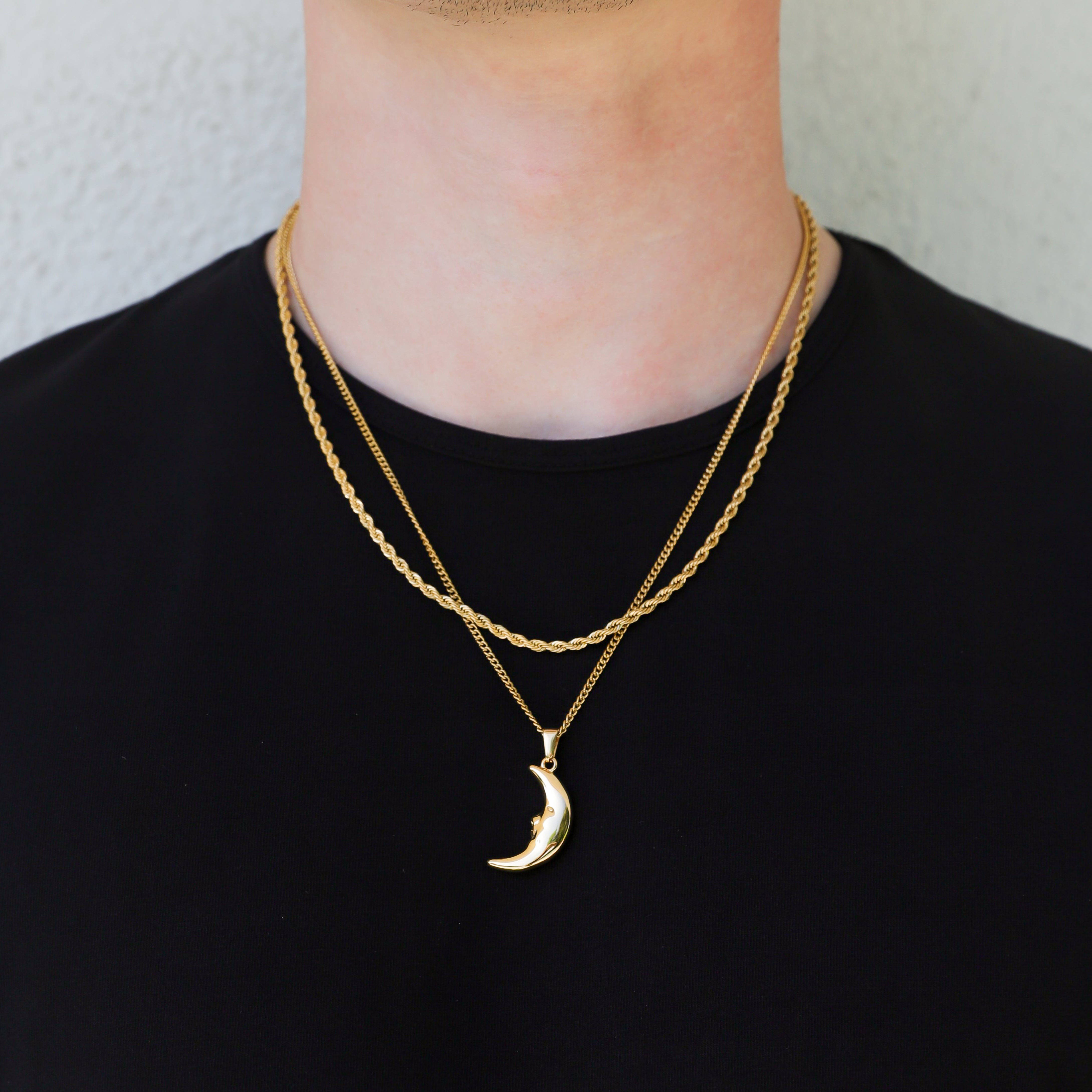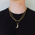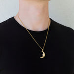 Elevate your look with this bold gold crescent moon pendant, crafted for the modern man. Suspended on a sturdy curb chain, the sleek design blends celestial symbolism with masculine edge. Perfect for layering or wearing solo, it’s a statement piece that speaks to strength and mystery.
