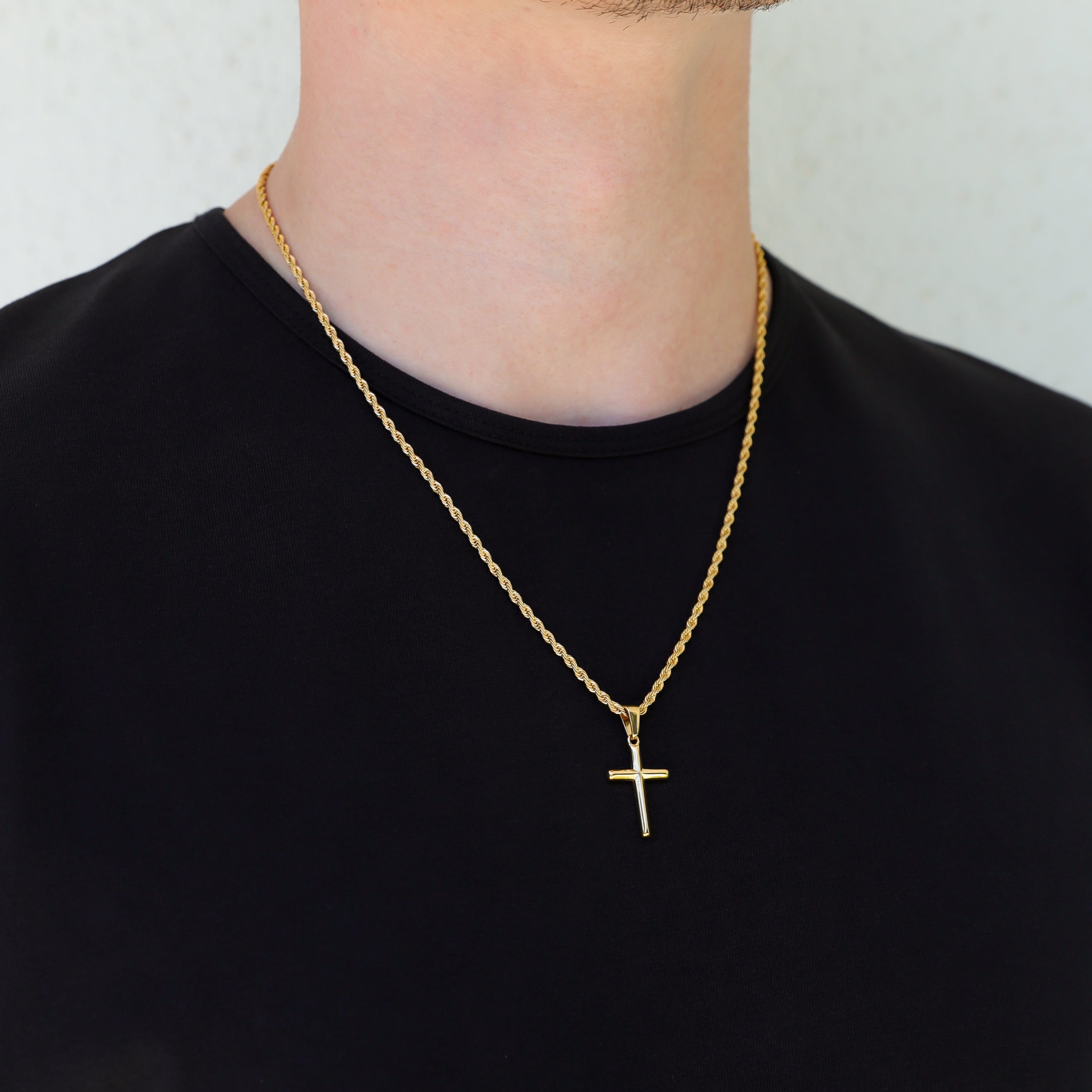 The stunning Cross pendant, the perfect symbol of faith and devotion for any stylish man. This pendant features a classic cross crafted in shining gold. The pendant hangs from a sturdy, matching gold chain, ensuring a secure and comfortable fit. Whether you wear it alone or layer it with other necklaces, this pendant is sure to make a statement and serve as a constant reminder of your faith. The Gold Cross pendant is a meaningful and timeless accessory, making it the perfect gift for yourself or someone special.