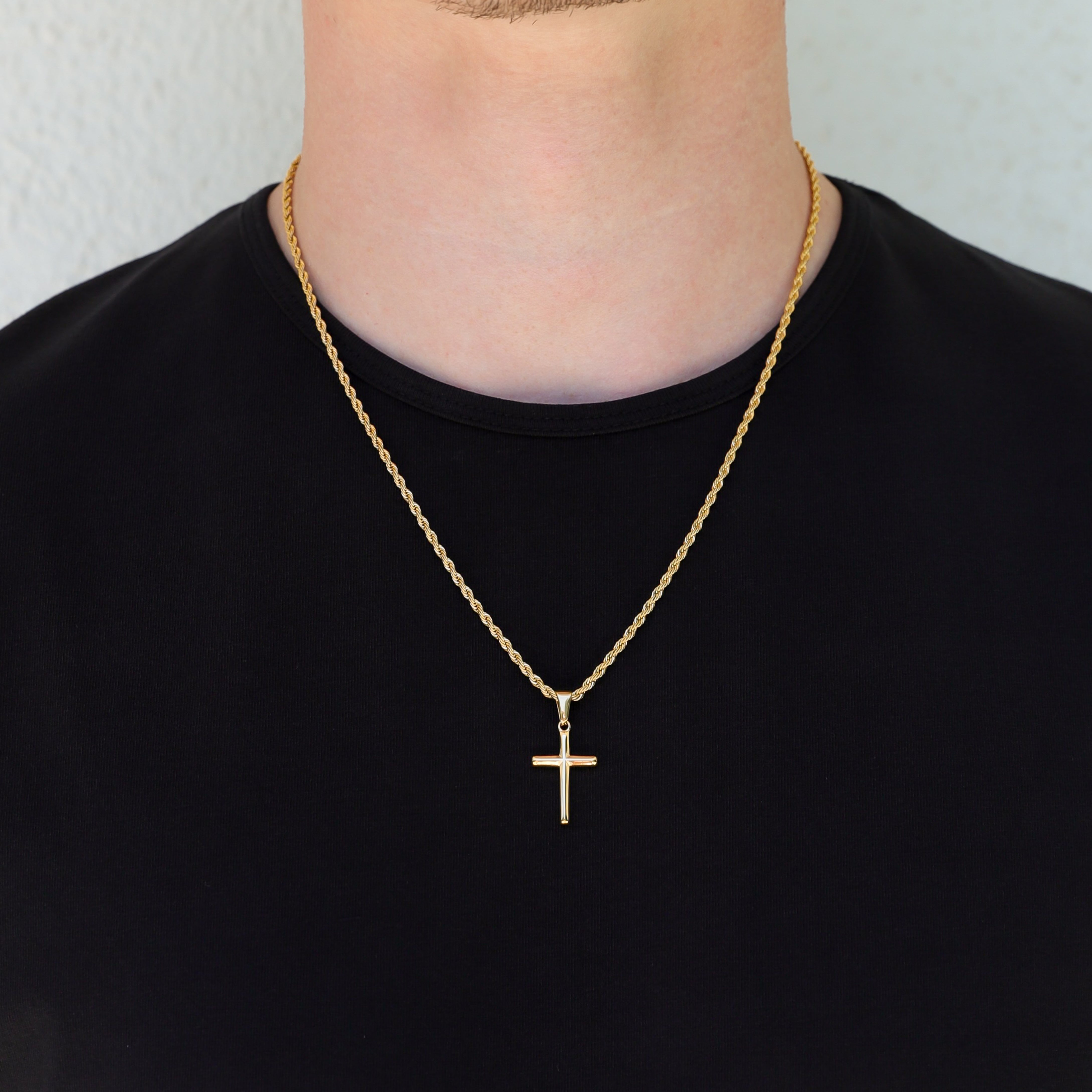 The stunning Cross pendant, the perfect symbol of faith and devotion for any stylish man. This pendant features a classic cross crafted in shining gold. The pendant hangs from a sturdy, matching gold chain, ensuring a secure and comfortable fit. Whether you wear it alone or layer it with other necklaces, this pendant is sure to make a statement and serve as a constant reminder of your faith. The Gold Cross pendant is a meaningful and timeless accessory, making it the perfect gift for yourself or someone special.